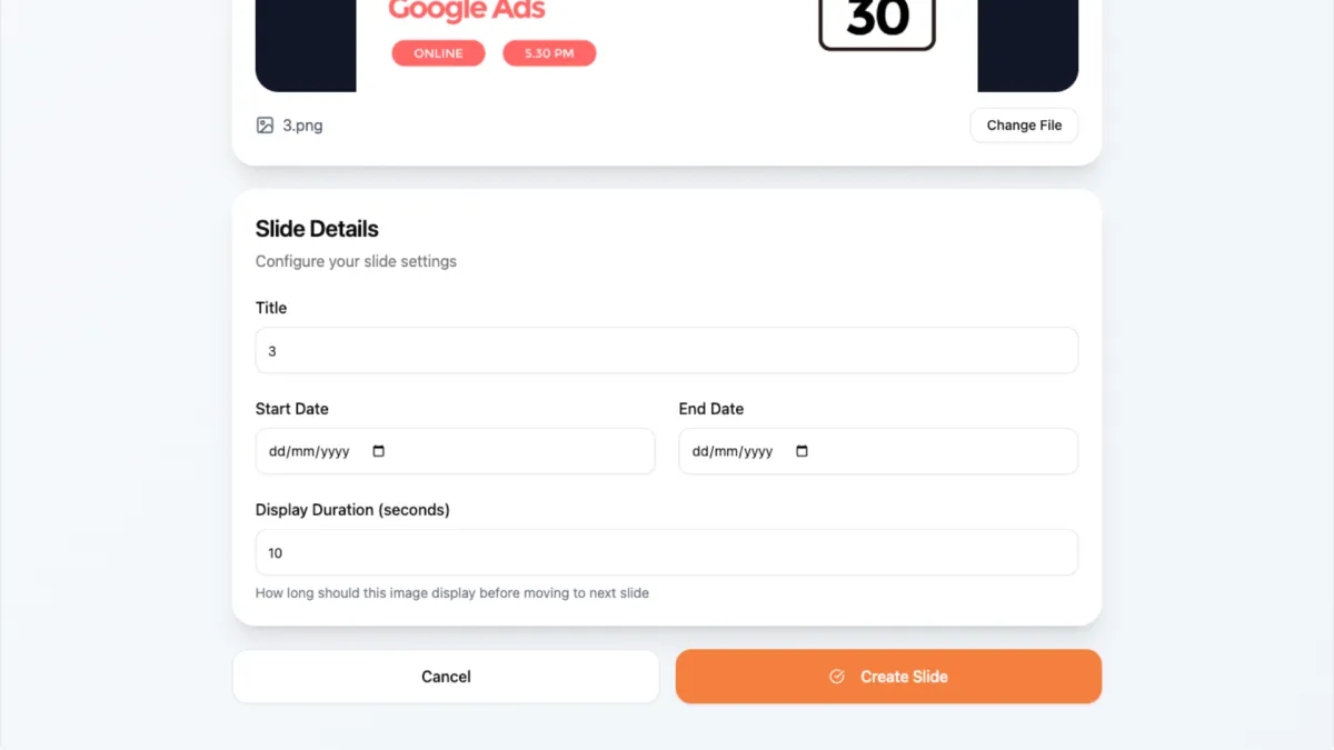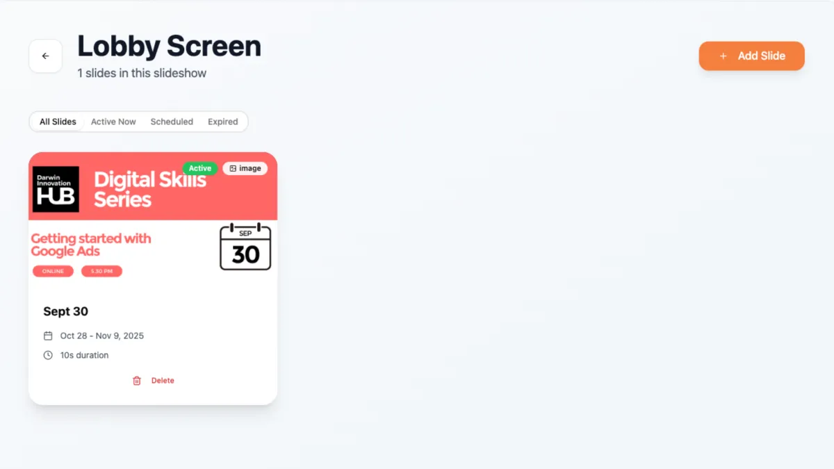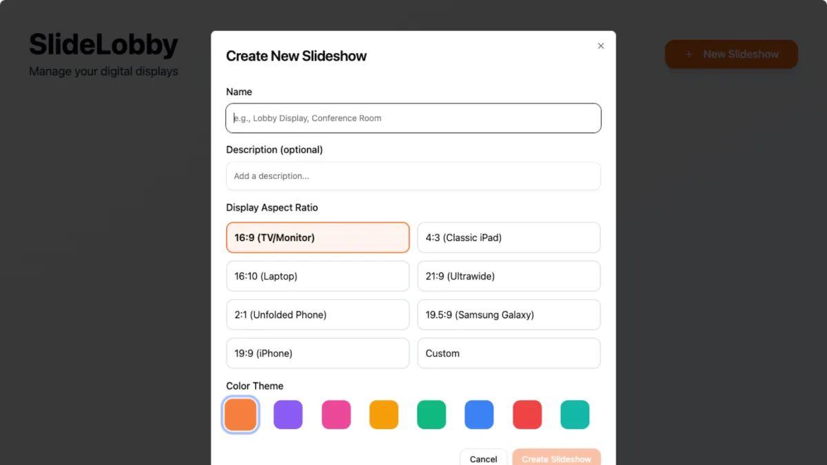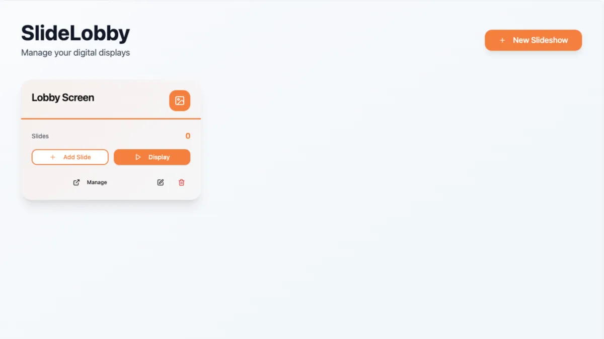 SlideLobby helps you create slideshows from your own graphics and videos so you can instantly run them on screens in offices, shopping centres, lobbies, entrances, conferences and events - all for free and with as many slideshows as you want.